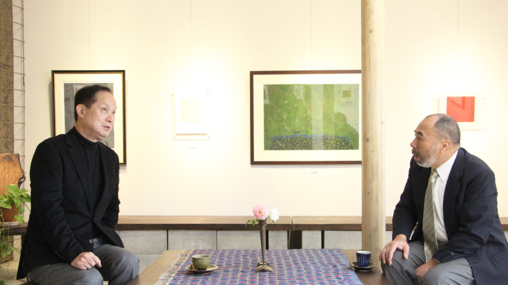 —2016年11月末、新年の個展に向けて、打ち合わせも兼ねて篆刻家・真鍋井蛙先生がヒロ画廊に来場されました。真鍋先生は作家活動30年以上、ヒロ画廊で展示をしていただき15年目、画廊店主の廣畑政也(以下、「ヒロ」)は、画商として30年、独立・開廊し2017年で20年を数えます。なにかと節目の年を迎えるお二人の対談をまとめました。