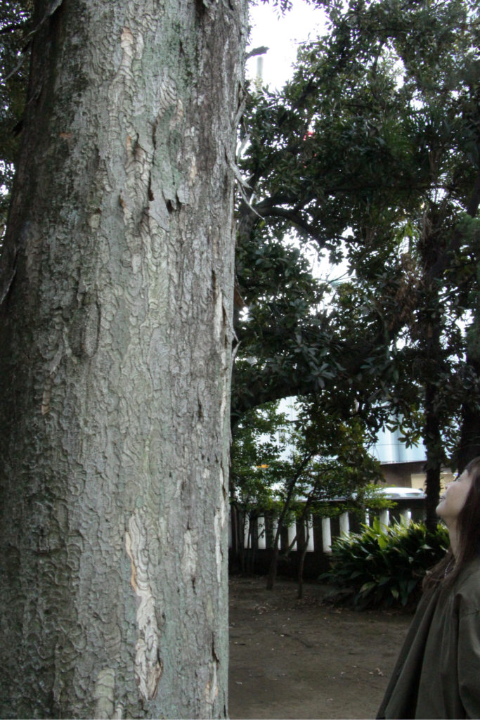 岡田 あまり外に出掛けるタイプではないのですが、武蔵野八幡宮にはよく行きます。林のように木がたくさん並んでいるので、日頃のリフレッシュにはちょうど良いです。もっとたくさん自然に触れたいときは、井の頭公園に出掛けますね。(【下写真】境内に立つケヤキの杢目を見ながら)こんな緑青の色合いの作品を作れたら、最高でしょうね。